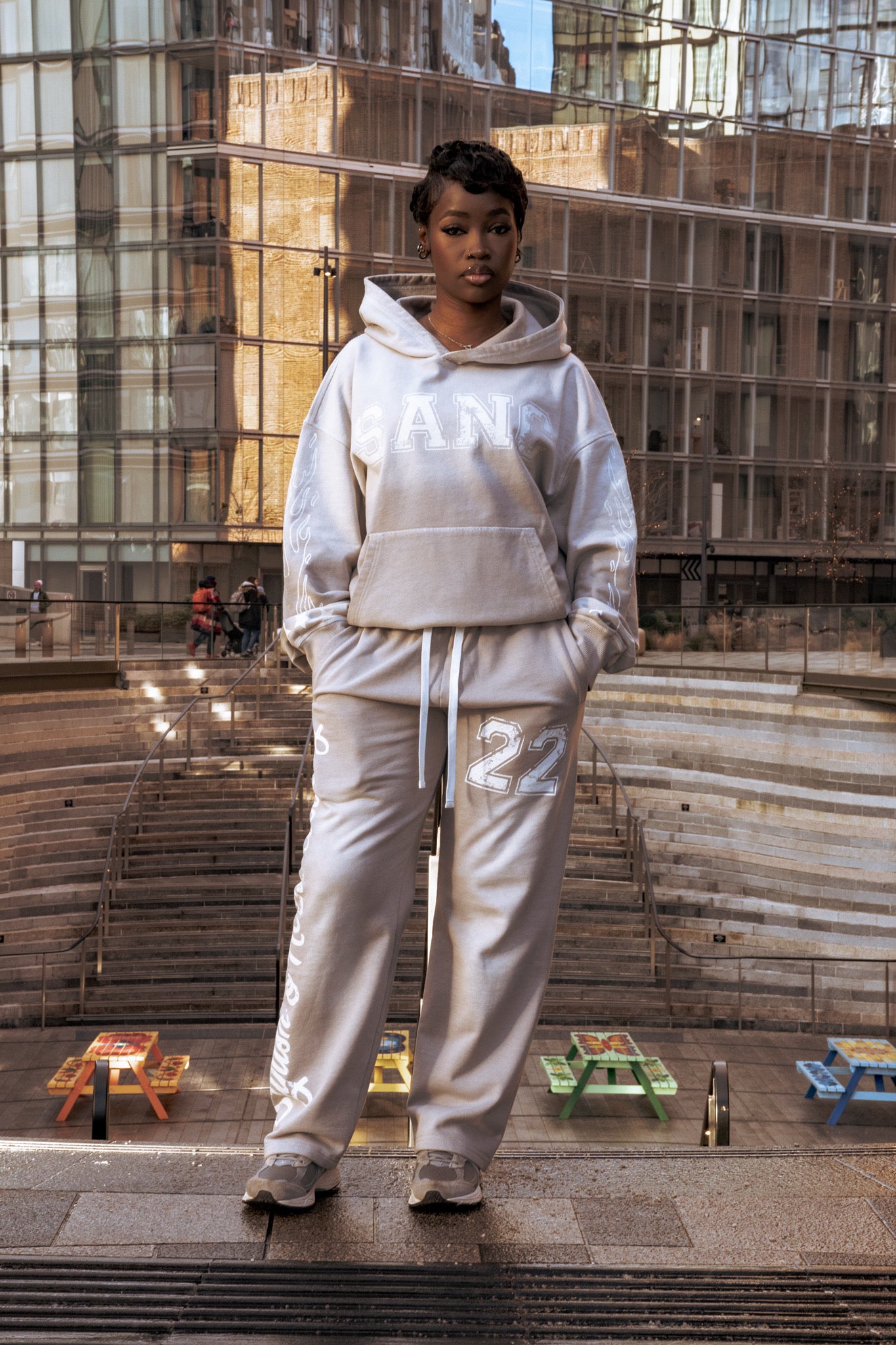 Heavyweight 300 GSM washed black bottoms designed for comfort and statement style. Showcasing a white screen-printed “22” on the leg and Stylish and Noble Clothing logo running down the side. Finished with white drawstrings. Made to pair seamlessly with the hoodie for a complete elevated streetwear look.